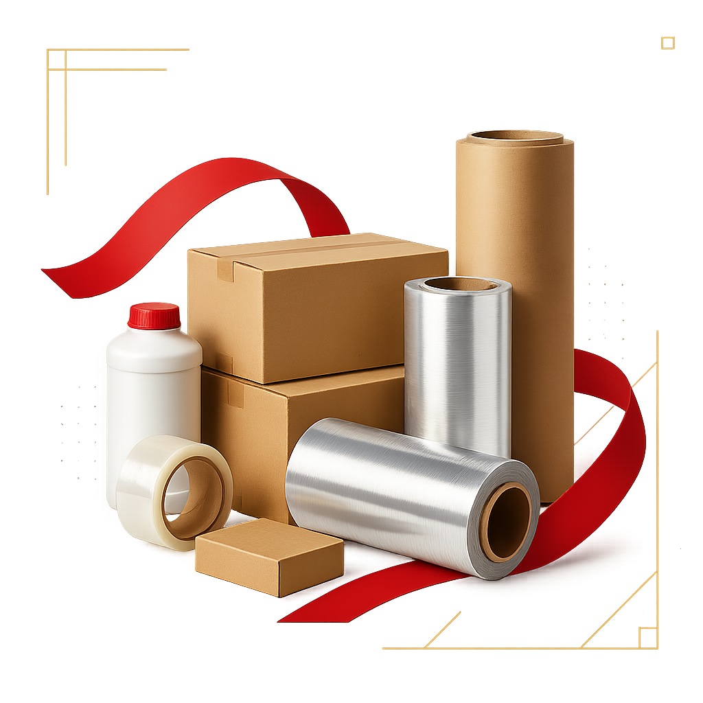 Films, foils, boxes, and adhesives – industrial grades.